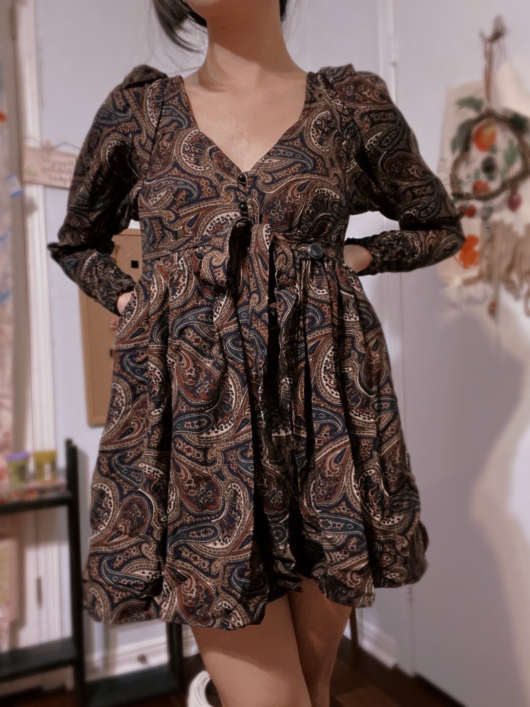 Later this week, I decided to sew up another dress with some fabric I had lying around in my stash. I thrifted this gorgeous, espresso-hued paisley print that gave me such NY-autumn vibes. Initially, I thought about making a skirt out of the material, but I settled for the classic, deep-v ruffle gown that’s currently hot on Pinterest. It wasn’t supposed to be a wrap dress, but what’s a girl gotta do with a few strips of elastic? The skirt came a bit short, so I definitely need to wear a pair of biker shorts underneath.
