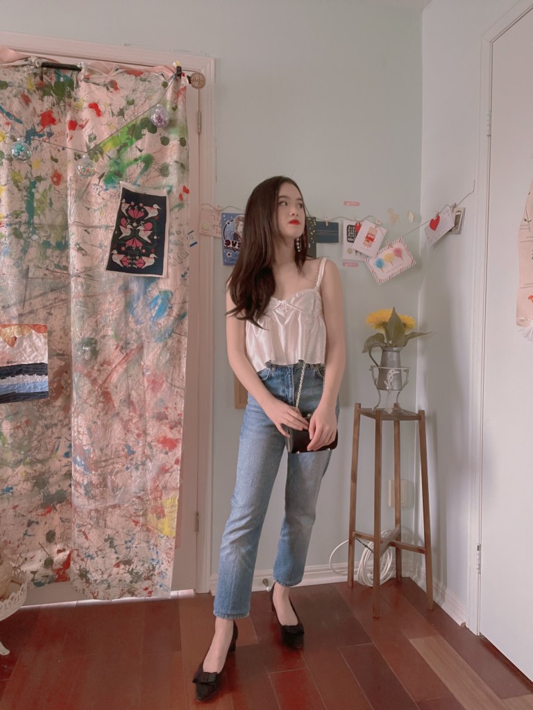 Next up on the chopping block is a white satin slip. Originally, I wanted to create a poet blouse with puffy sleeves, but I didn’t have enough fabric for it. Instead, I opted for a bustier, spaghetti strap moment with cups and a ruffled front. If I had enough material, I would’ve definitely made the top more voluminous and dramatic. If you zoomed into the picture, you can probably see that the hem is unfinished. Of course, I plan to complete a rolled hem, but I thought the raw edge gave a sort of ‘sensual’ feel to the outfit? I don’t know, but it gave me ‘Elizabeth Bennet and Mr.Darcy conversing in the rain’ kind of vibes. Composed, but oddly seductive.