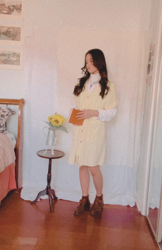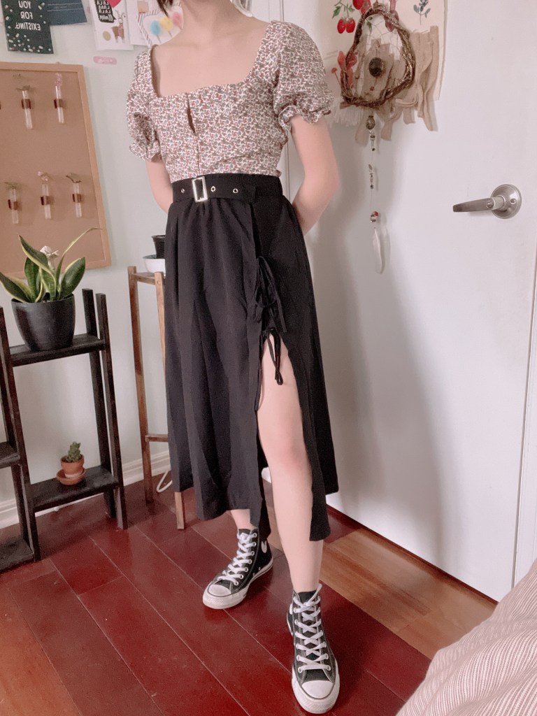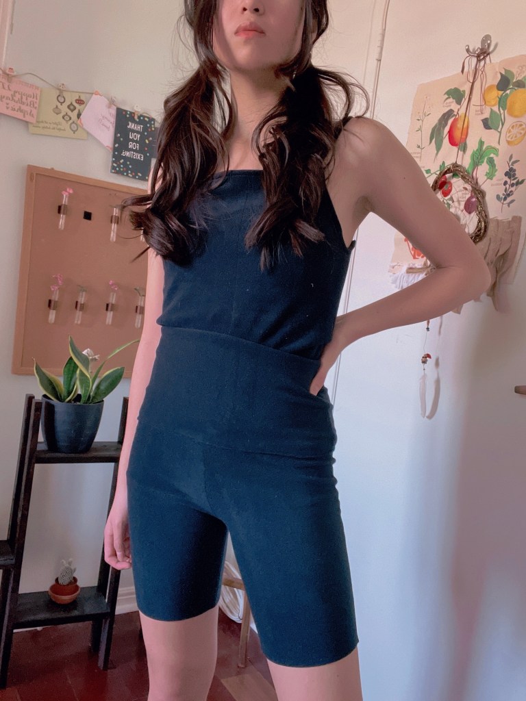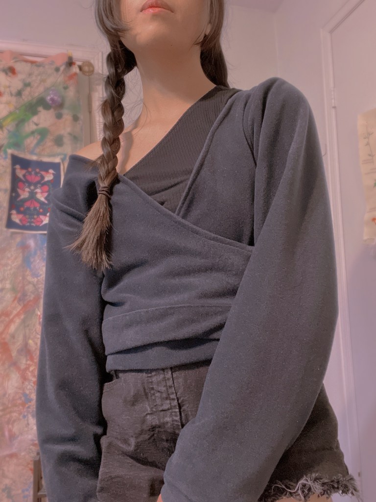 This cozy wrap is considered the final addition to my biker short and spaghetti strap set. It’s made out of the same material (which is a a fuzzy, jersey knit I thrifted a while back). I got my inspo from a product picture I found on Yesstyle. Since I’m skeptical on ordering things from that marketplace, I decided to make my own version. it’s a little different- but I like how it turned out. If I were to remake it again- I’ve got to nail the sleeves. The original had a balloon cut- which made it extra elegant.